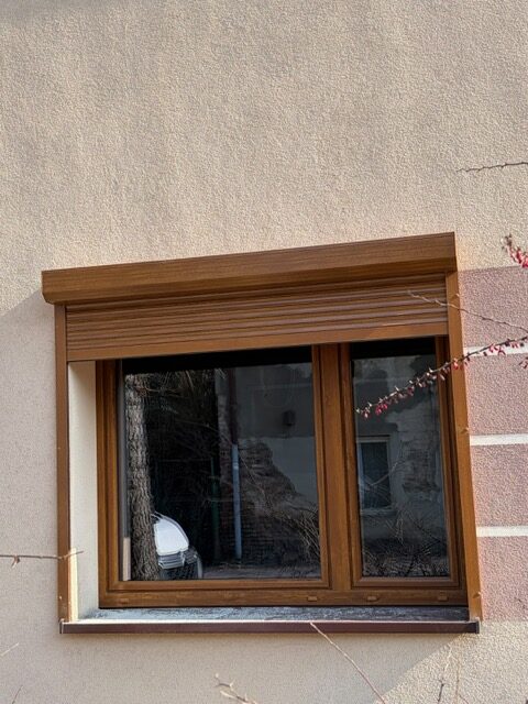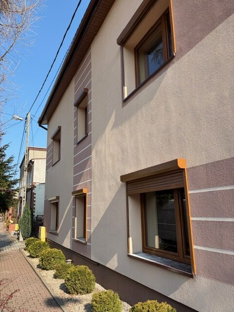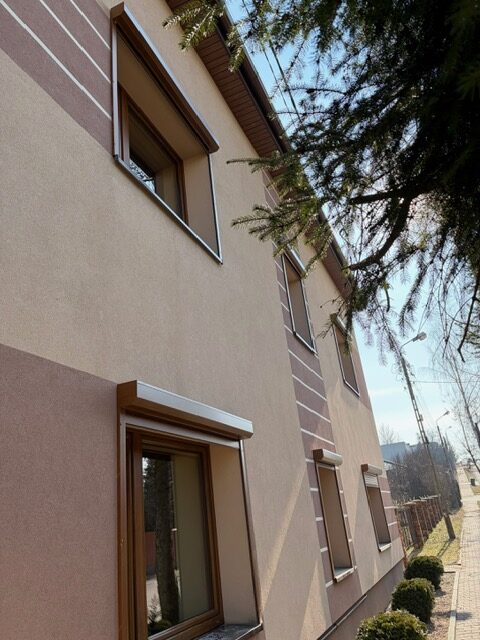 Przy ociepleniu 20 cm kluczowe było solidne mocowanie, dlatego zastosowaliśmy śruby 26 cm, aby bezpiecznie przejść przez warstwę styropiany i zakotwić konstrukcję bezpośrednio w murze nośnym. Kolor złoty dąb, klasyczny i ponadczasowy.